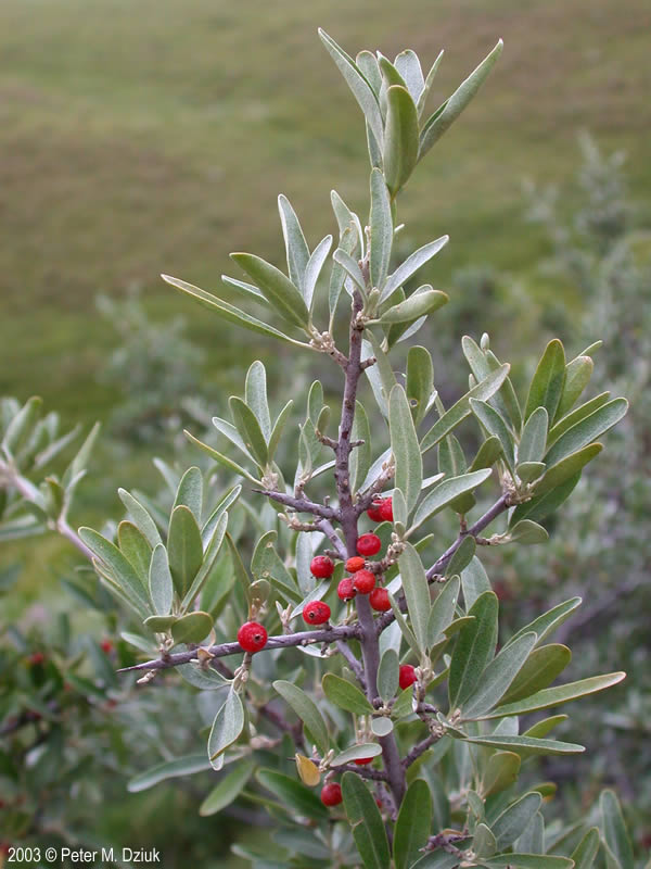 Canada buffaloberry is the only one with green instead of grey leaves. Here you see the red berries that rippen in mid to late summer.