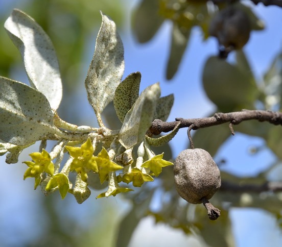 Wolfwillow branch showing twisted leaves, flowers, and a single berry from last year.