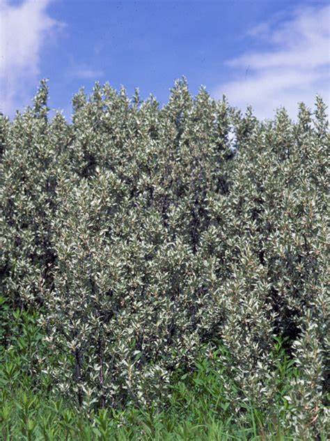 Wolf willow is not a willow, but a member of the same genus as Russian olive. The leaves are grey-green, with very pale undersides, but unlike other members of this group are only about twice as long as they are wide. The leaves are not flat, but are curled and twisted. It tends to form thickets, 4 to 8 feet tall.